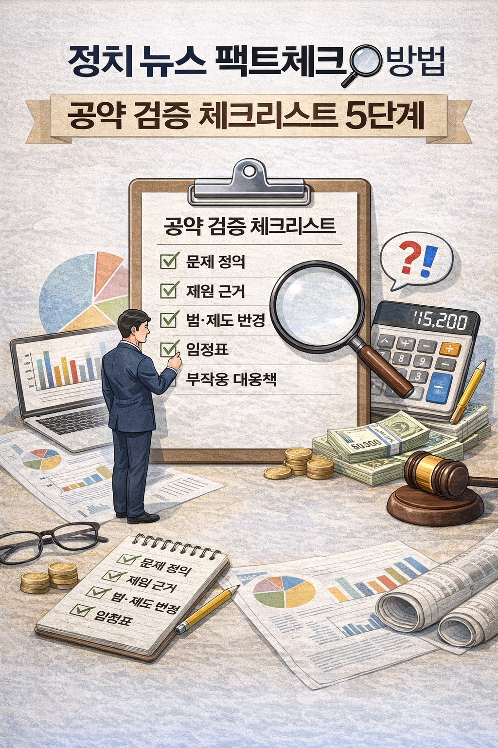 정치 공약 검증 방법은 문제 정의, 재원 근거, 법·제도 변경 여부, 일정표, 부작용 대응책 5가지를 확인하는 것입니다. 선거 시즌이 아니어도 꾸준히 적용 가능한 유권자 정보 검증 루틴으로 활용하실 수 있습니다.